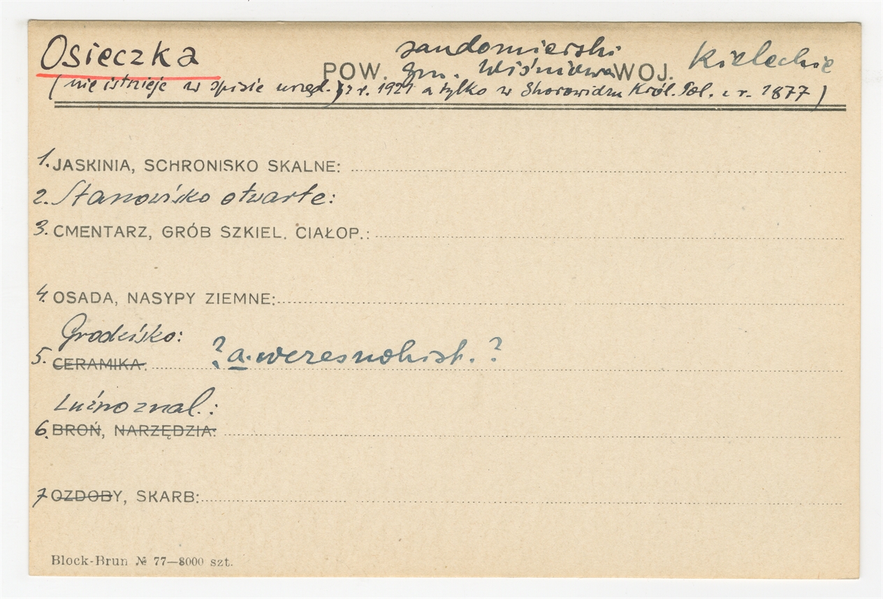 Karta stanowiska "Osieczka (nie istnieje w spisie urzęd. z r. 1927 a tylko w Skorowidzu Król. Pol. z r 1877) gm. Wiśniowa pow. Sandomierski woj. Kieleckie" (druk rękopis) - strona 1