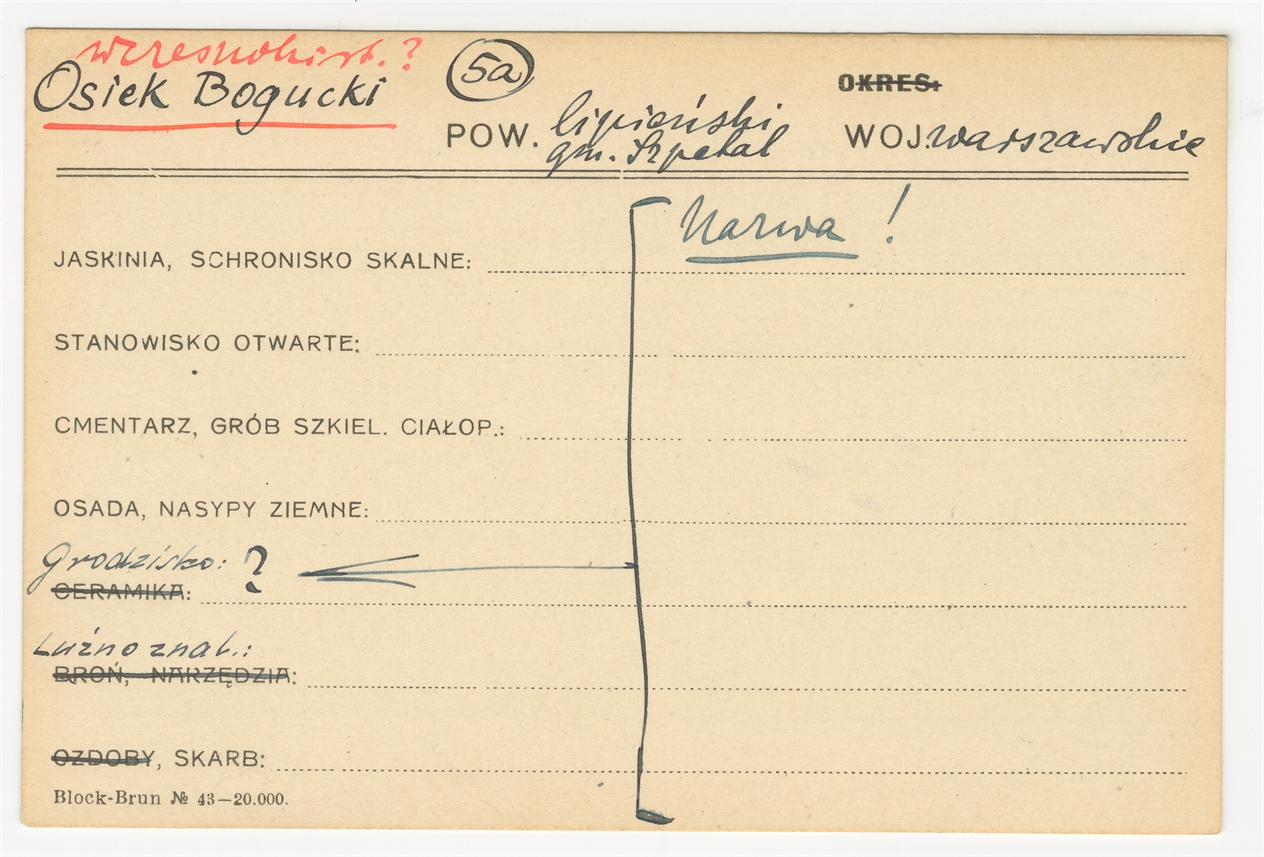 Karta stanowiska "Osiek Bogucki gm. Szpetal pow. lipieński woj. warszawskie" (druk rękopis) - strona 1
