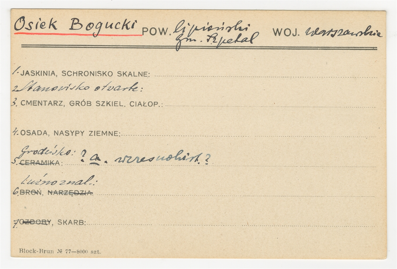 Karta stanowiska "Osiek Bogucki gm. Szpetal pow. lipieński woj. warszawskie" (druk rękopis) - strona 1