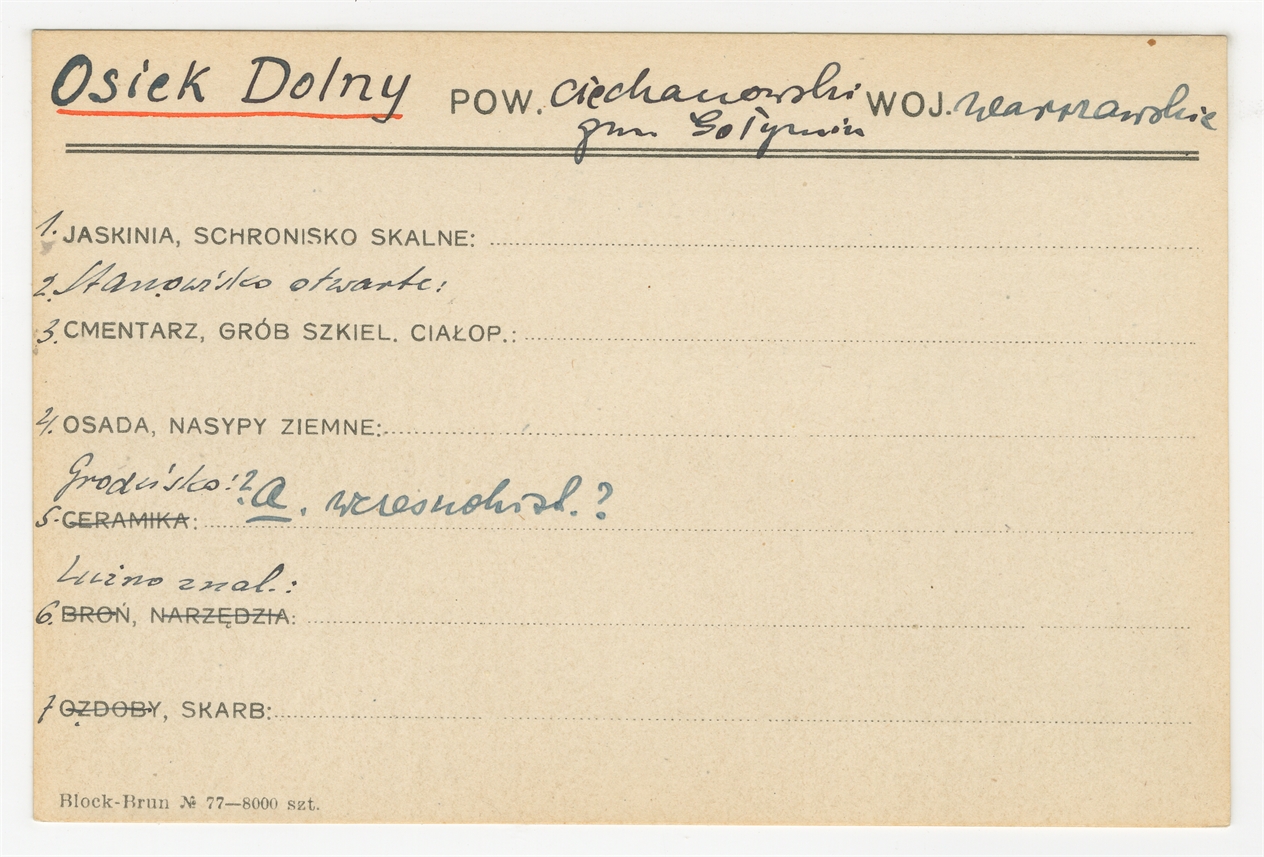 Karta stanowiska "Osiek Dolny gm. Gołymin pow. ciechanowski woj. warszawskie" (druk rękopis) - strona 1