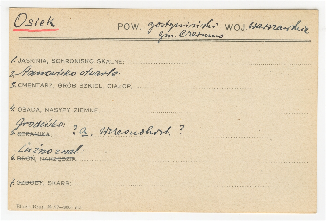 Karta stanowiska "Osiek gm. Czermno pow. gostyniński woj. warszawskie" (druk rękopis) - strona 1