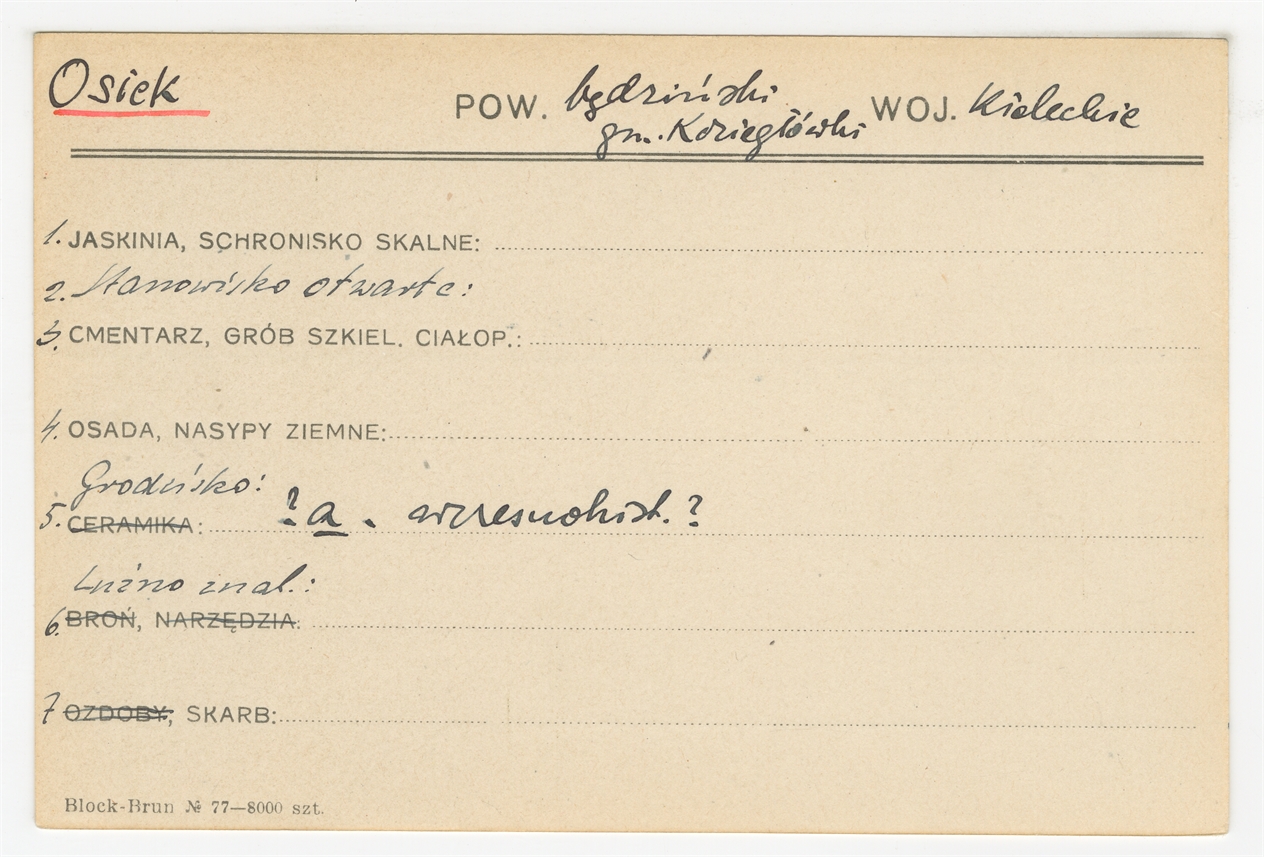 Karta stanowiska "Osiek gm. Koziegłowy pow. będziński woj. kieleckie" (druk rękopis) - strona 1