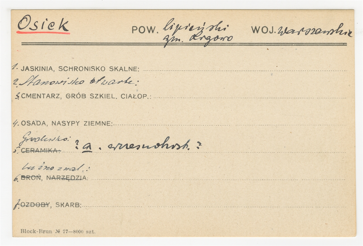 Karta stanowiska "Osiek gm. Ligowo pow. lipieński woj. warszawskie" (druk rękopis) - strona 1