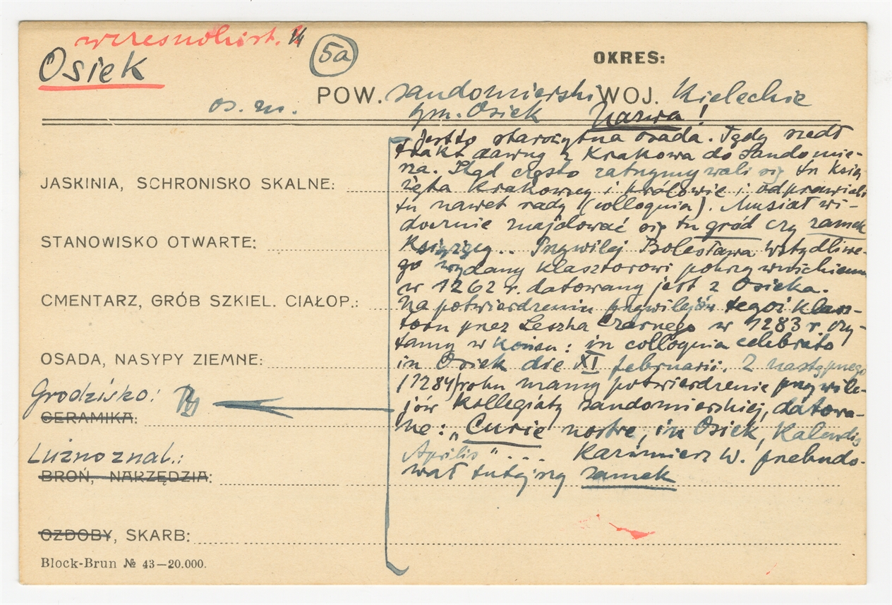 Karta stanowiska "Osiek gm. Osiek pow. sandomierski woj. kieleckie" (druk rękopis) - strona 1