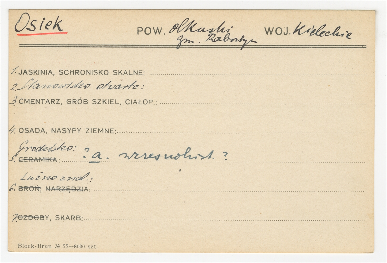 Element 1 - Karta stanowiska "Osiek gm. Rabsztyn pow. olkuski woj. Kieleckie" (druk rękopis) - strona 1