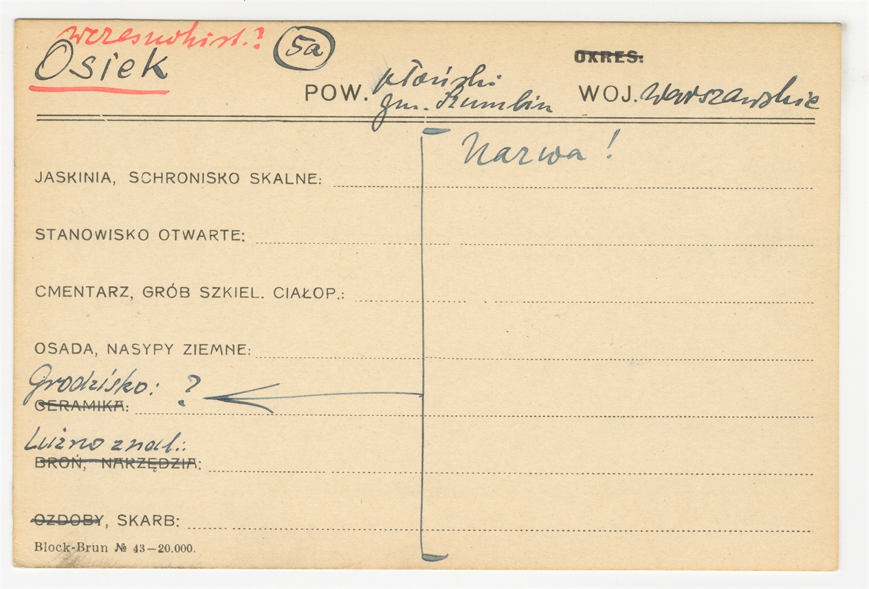 Karta stanowiska "Osiek gm. Szumlin pow. płoński woj. warszawaskie" (druk rękopis) - strona 1