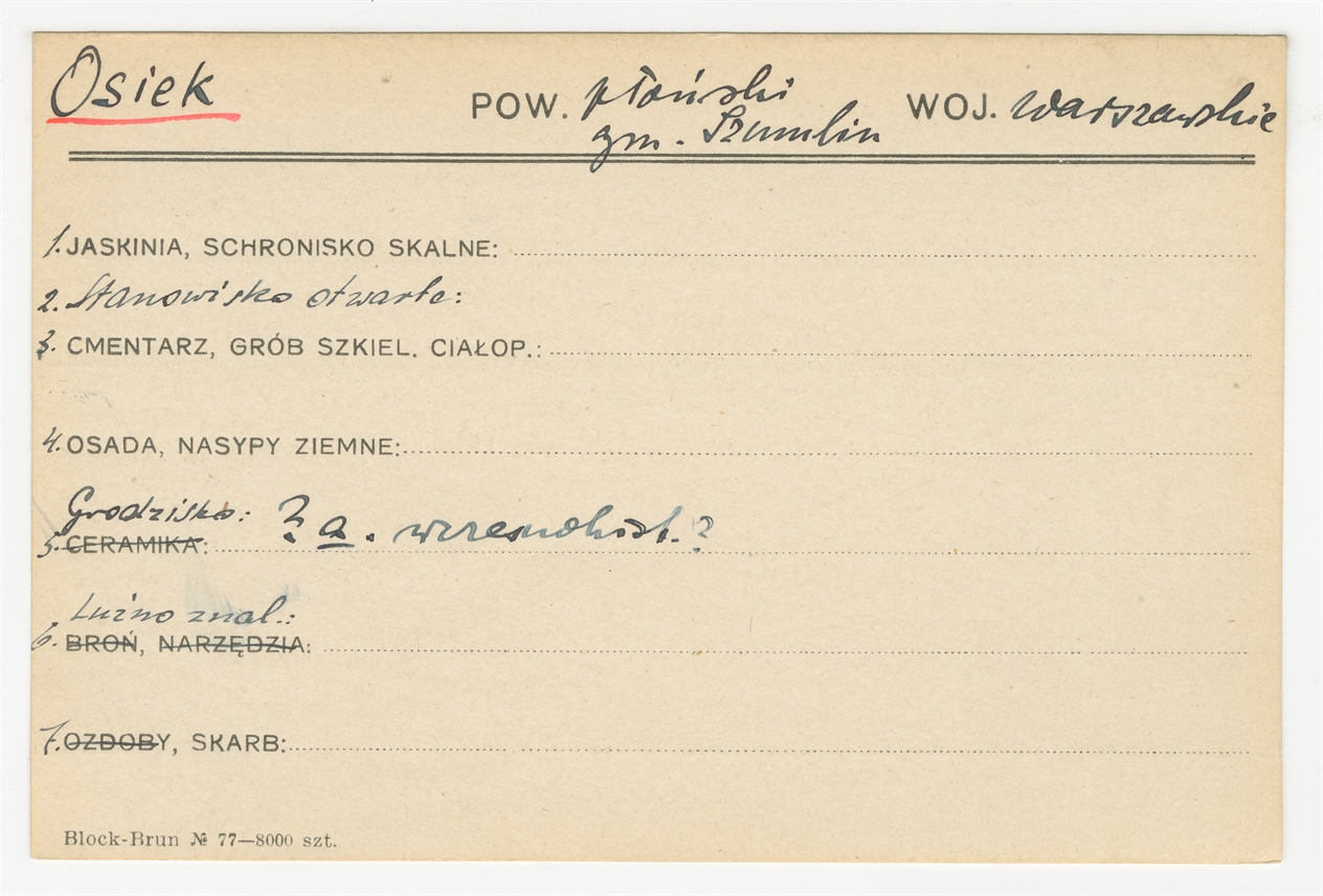 Karta stanowiska "Osiek gm. Szumlin pow. płoński woj. warszawaskie" (druk rękopis) - strona 1