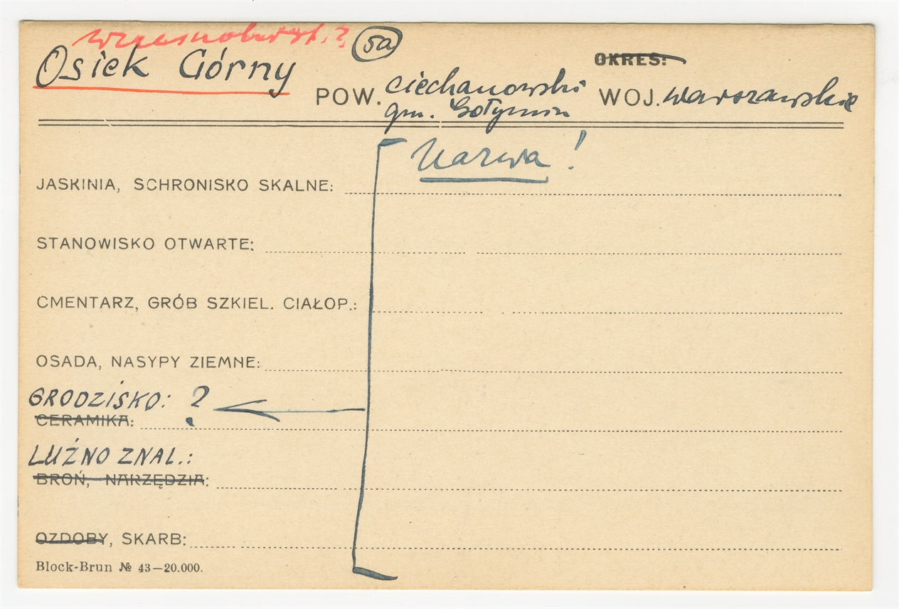 Karta stanowiska "Osiek Górny gm. Gołymin pow. ciechanowski woj. warszawskie" (druk rękopis) - strona 1
