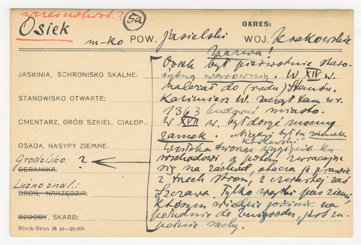 Karta stanowiska "Osiek m-ko pow. jasielski woj. krakowskie" (druk rękopis) - strona 1