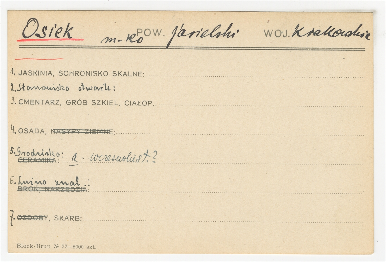 Element 1 - Karta stanowiska "Osiek m-ko pow. jasielski woj. krakowskie" (druk rękopis) - strona 1