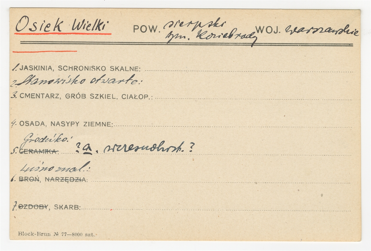 Karta stanowiska "Osiek Wielki gm. Koziebrody pow. sierpecki woj. warszawskie" (druk rękopis) - strona 1