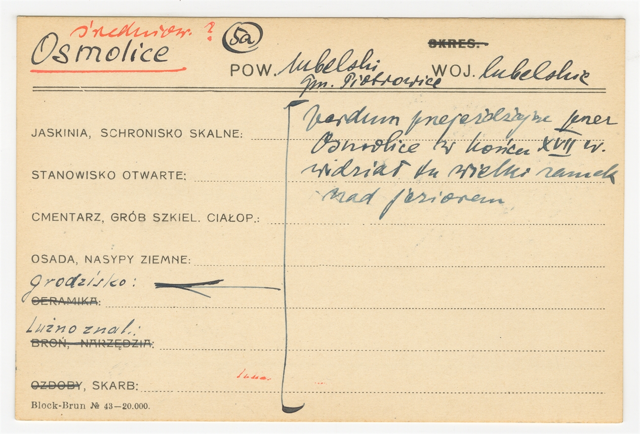 Karta stanowiska "Osmolice gm. Piotrowice pow. lubelski woj. lubelskie" (druk rękopis) - strona 1