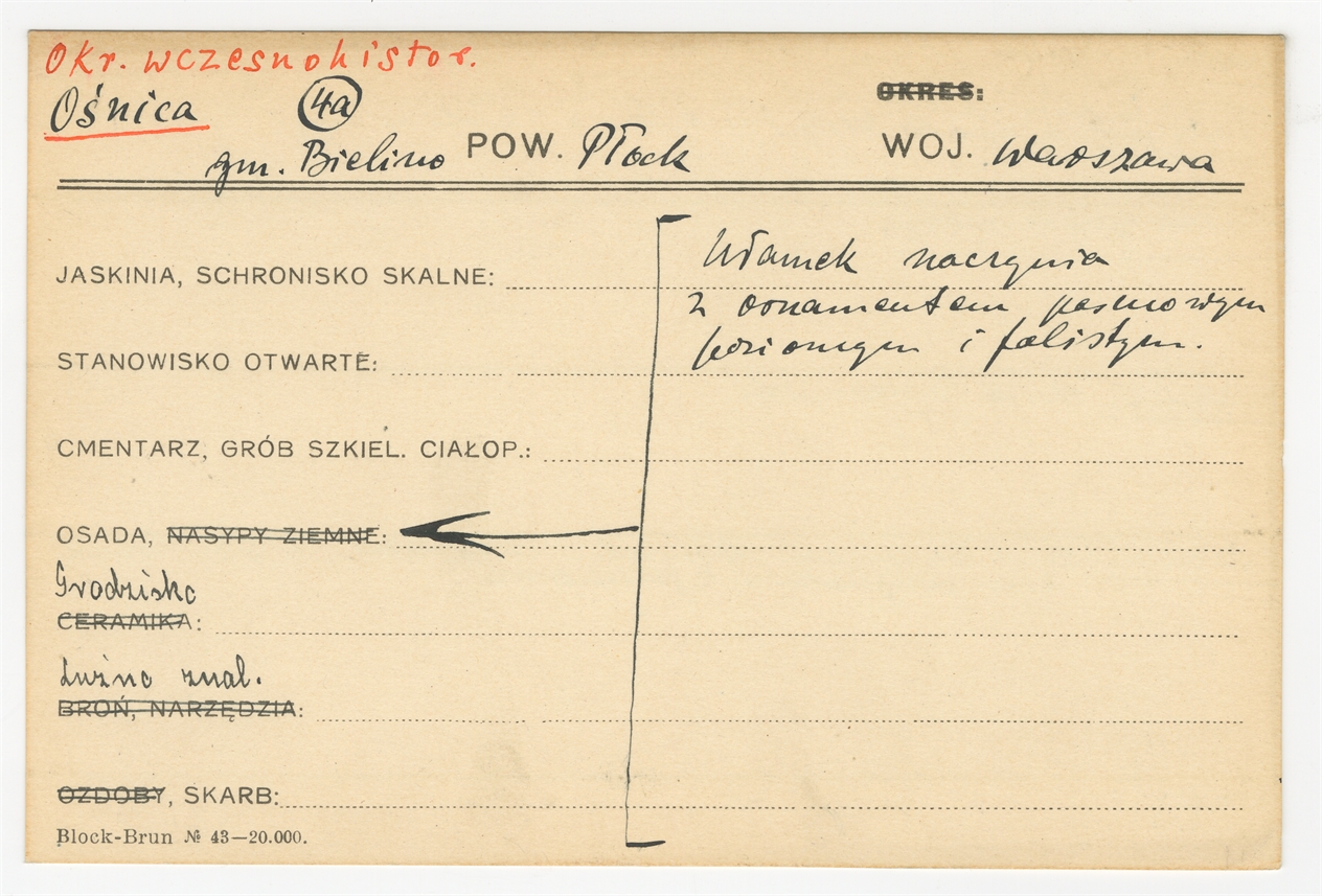 Karta stanowiska "Ośnica gm. Bielino pow. Płock woj. Warszawa" (druk rękopis) - strona 1
