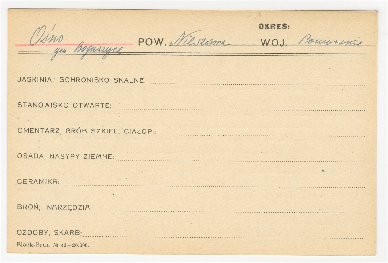 Karta stanowiska "Ośno pow. Boguszyce pow. Nieszawa woj. Pomorskie" (druk rękopis) - strona 1