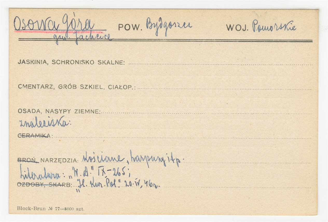 Karta stanowiska "Osowa Góra gm Jachcice pow. Bydgoszcz woj. Pomorskie' (druk rękopis) - strona1