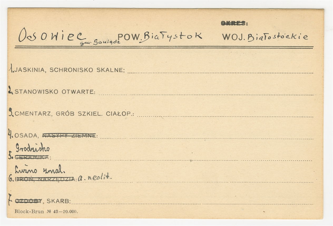 Karta stanowiska "Osowiec gm. Goniądz pow. Białystok woj. Białostockie" (druk rekopis) - strona 1