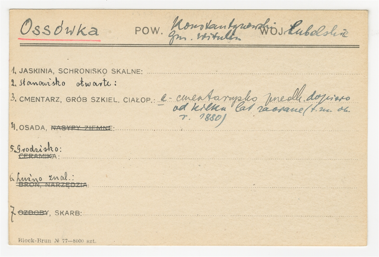 Karta stanowiska "Ossówka gm. Witulin pow. Konstantynowski woj. lubelskie" (druk rękopis) - strona 1