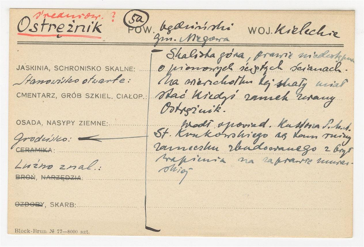 Karta stanowiska "Ostrężnik gm. Niegowa pow. będziński woj. Kieleckie" (druk rękopis) - strona 1