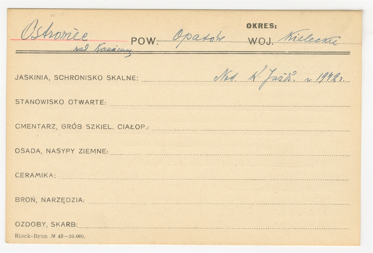 Karta stanowiska "Ostromice nad Kamienną pow Opatów woj. Kieleckie" (druk rękopis) - strona 1