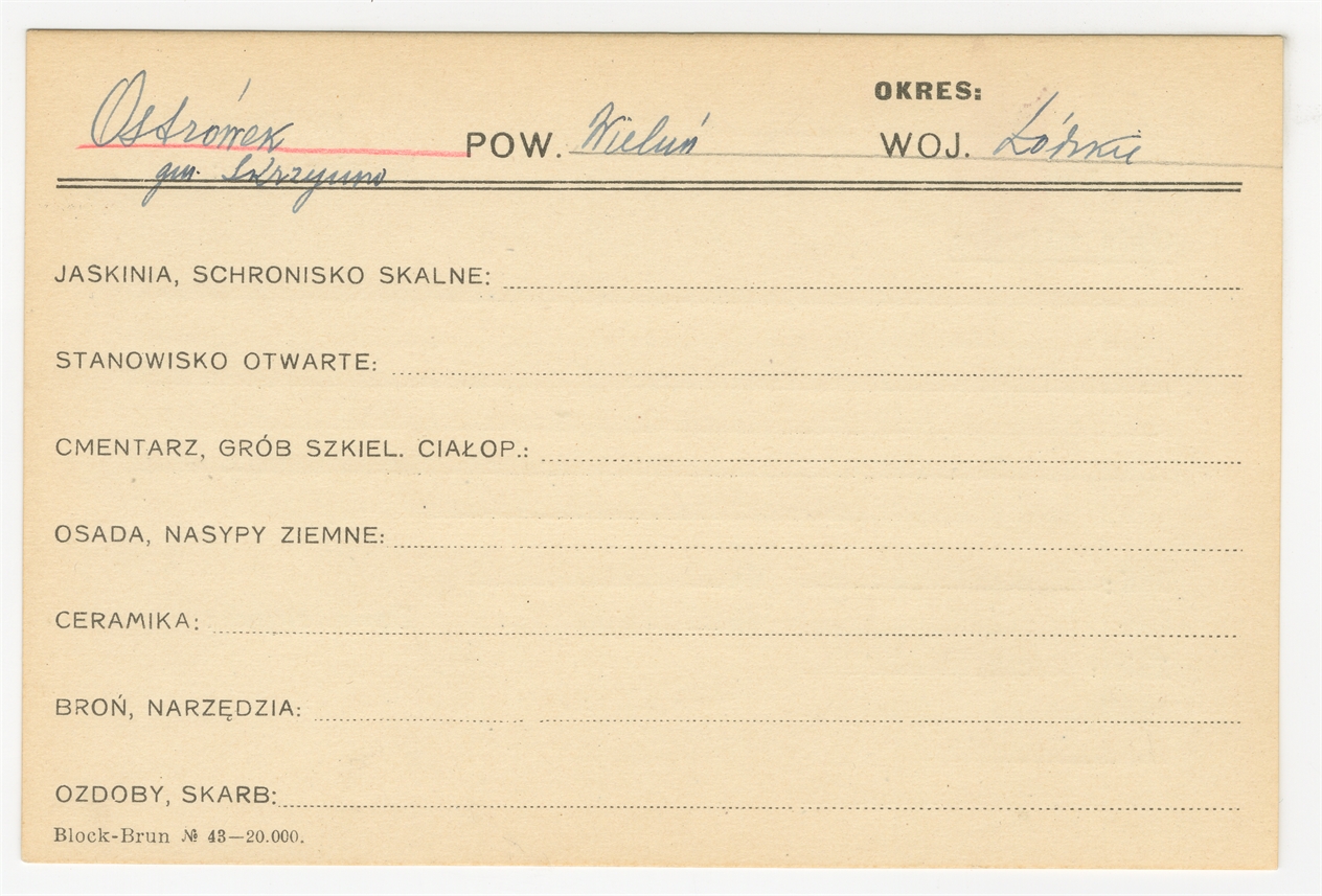 Karta stanowiska "Ostrówek gm. Skrzynno pow. Wieluń woj. Łódzkie" (druk rękopis) - strona 1