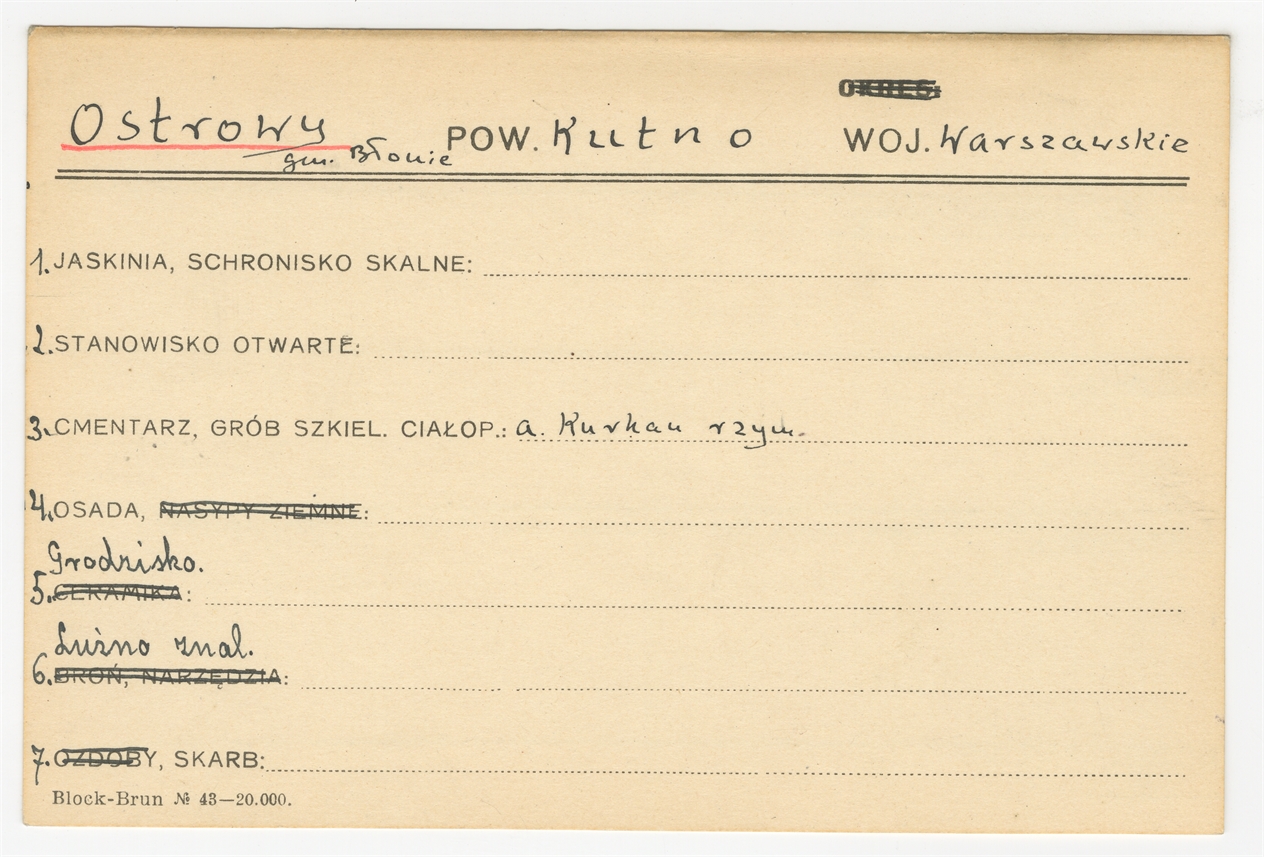 Karta stanowiska "Ostrowy gm. Błonie pow. Kutno woj. Warszawskie" (druk rekopis) - strona 1