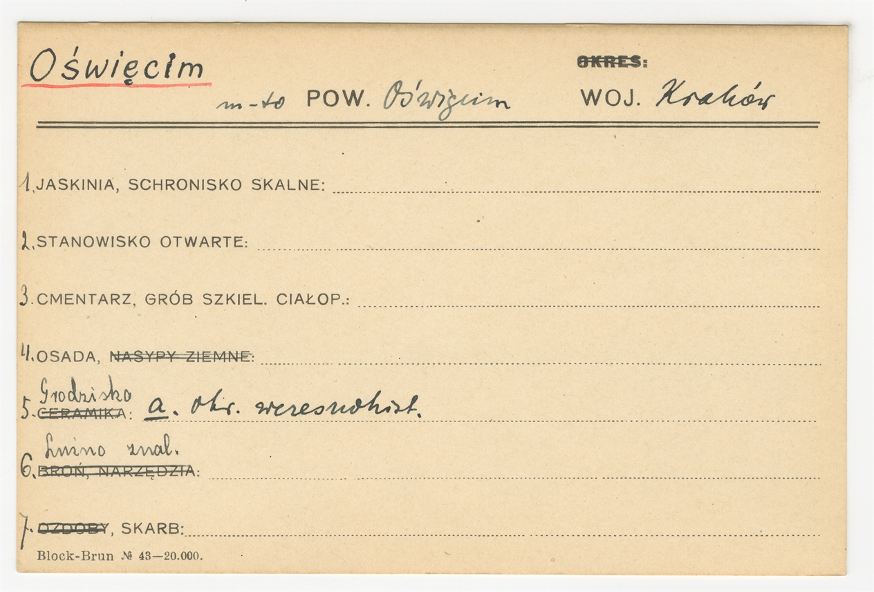 Karta stanowiska "Oświecim m-to pow. Oświecim woj. Kraków" (druk rękopis) - strona 1