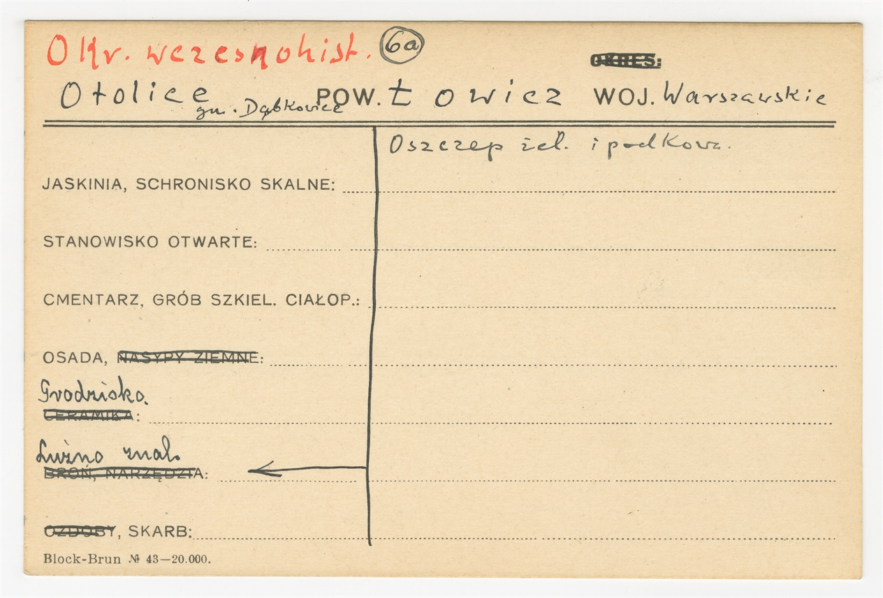 Element 1 - Karta stanowiska "Otolice gm. Dąbkowice pow. Łowicz woj. Warszawskie" (druk rękopis) - strona 1