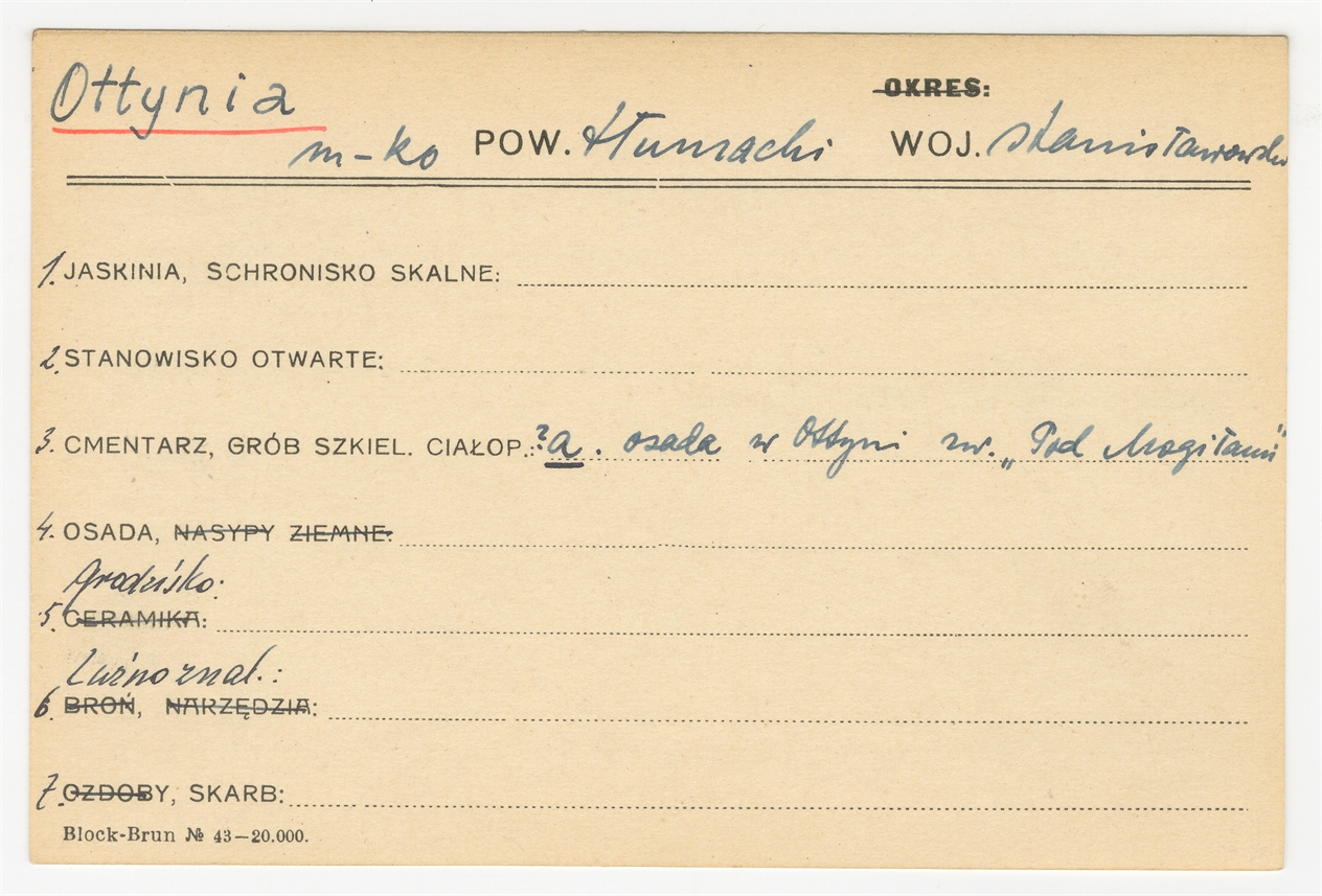 Karta stanowiska "Ottynia m-ko pow. tłumacki woj. stanisławowskie" (druk rekopis) - strona 1