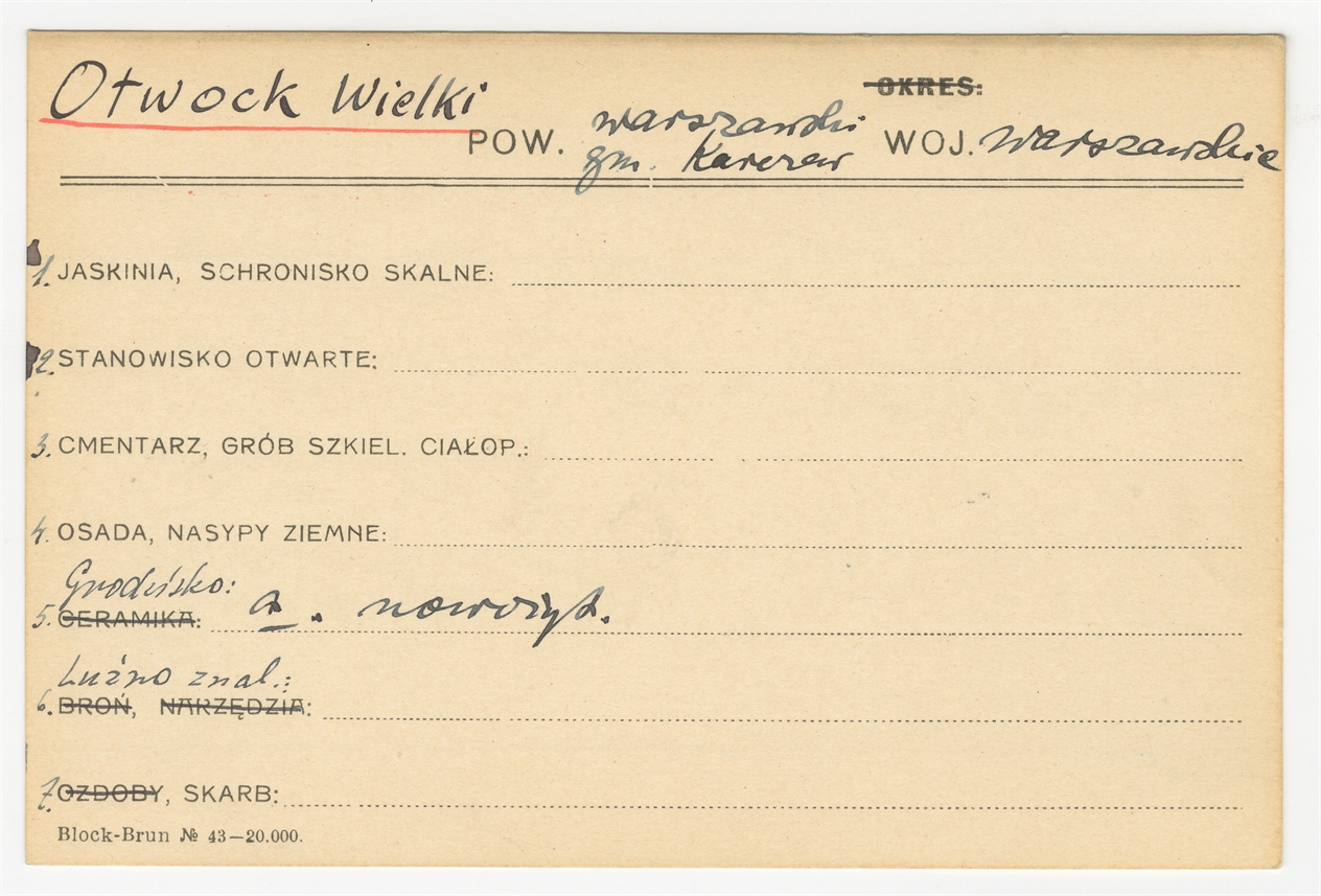 Karta stanowiska "Otwock Wielki gm. Karczew pow. warszawski woj. warszawskie" (druk rękopis) - strona 1