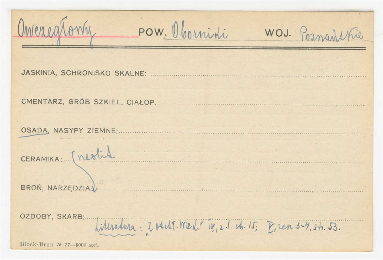 Karta stanowiska "Owczegłowy pow. Obornicki woj. Poznańskie" (druk rękopis) - strona 1