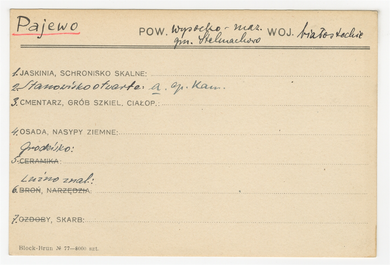 Karta stanowiska "Pajewo gm. Stelmachowo pow. wysocko-maz. woj. białostockie" (druk rękopis) - strona 1