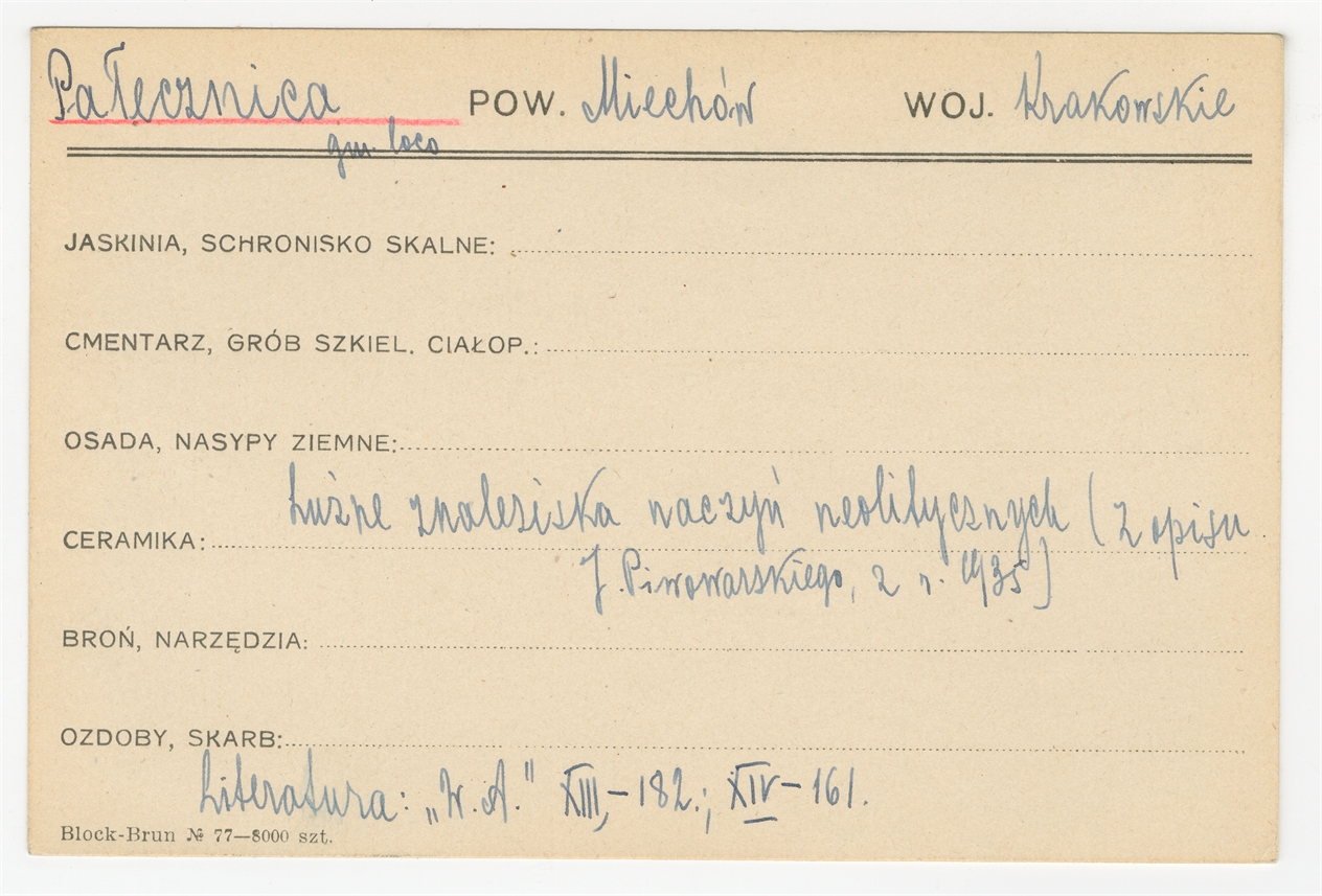 Karta stanowiska "Pałecznica gm. loco pow. Miechów woj. Krakowskie" (druk rękopis) - strona 1