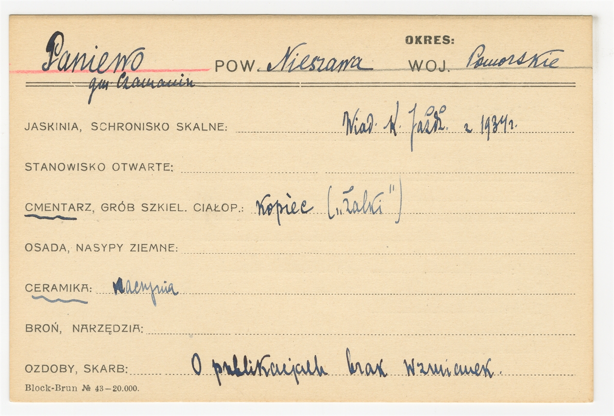 Karta stanowiska "Paniewo gm. Czamanin pow. Nieszawa woj. Pomorskie" (druk rękopis) - strona 1