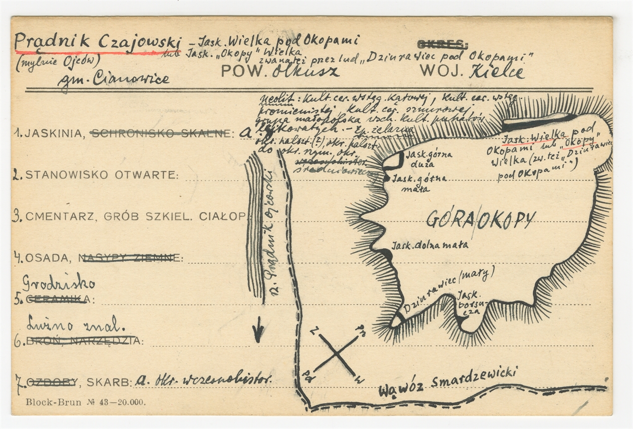 Karta stanowiska "Pąrądnik Czajowski (mylnie Ojców) - Jask. pod Okopami lub Jask. "Okopy" Wielka zwana też przez lud "Dziurawiec pod Okopami"" (druk rękopis) - strona 1
