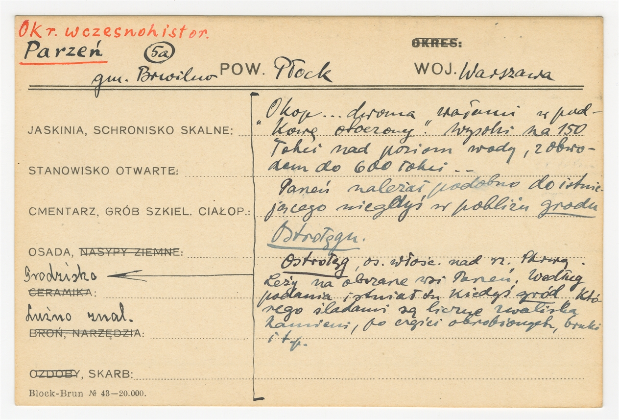 Karta stanowiska "Parzeń gm. Brwilno pow. Płock woj. Warszawa" (druk rękopis) - strona 1