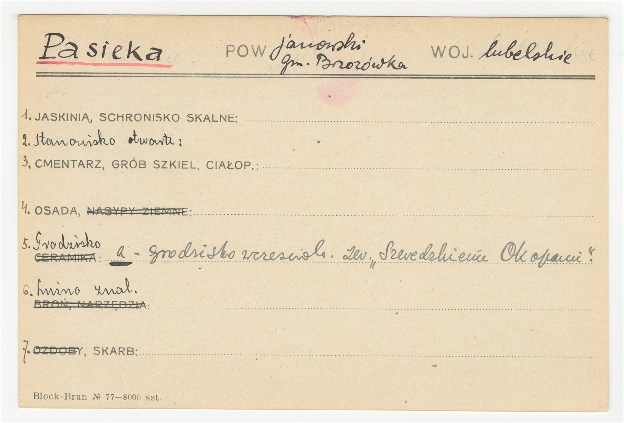 Karta stanowiska "Pasieka gm. Brzozówka pow. janowski woj. lubelskie" (druk rękopis) - strona 1