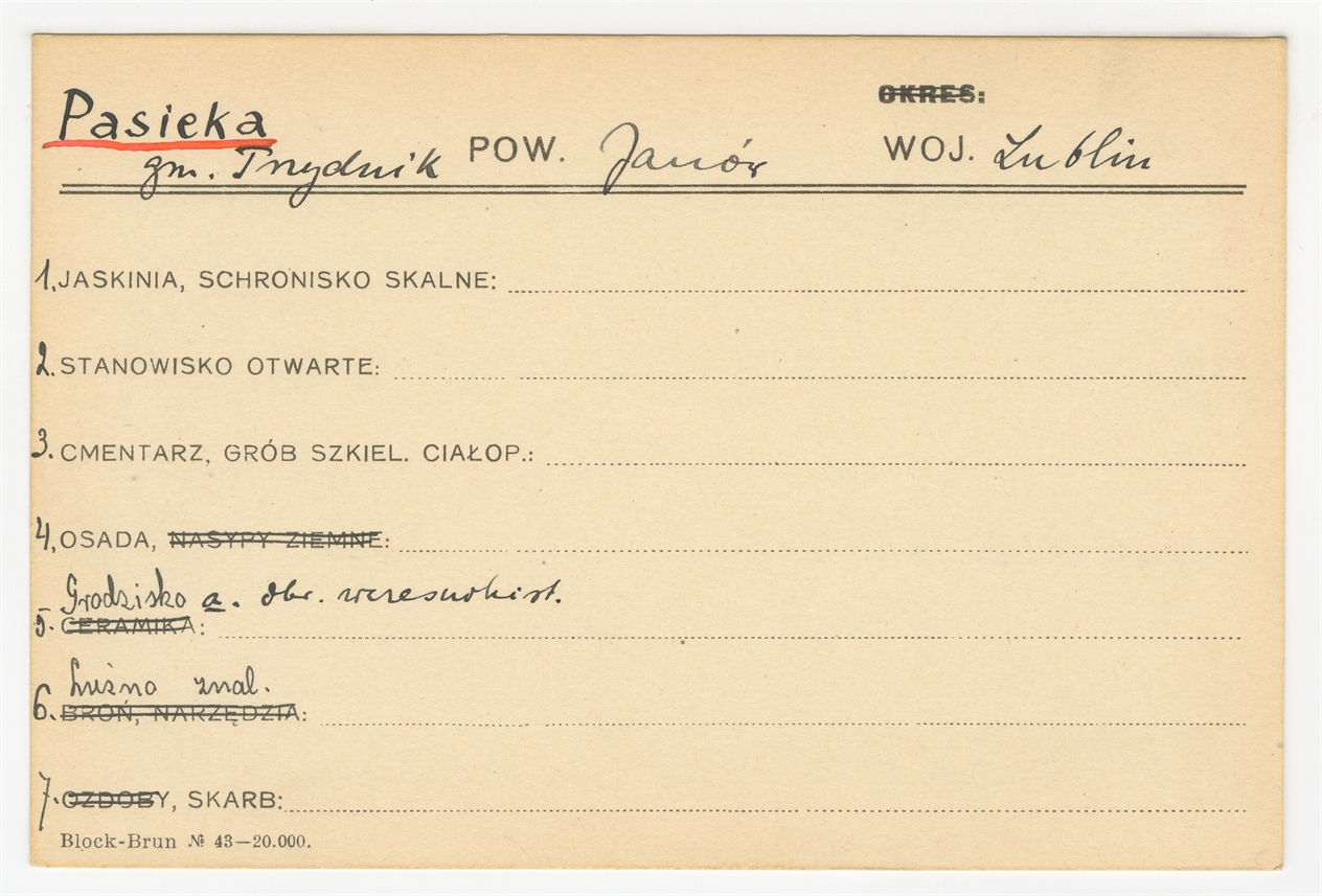 Karta stanowiska "Pasieka gm. Trzydnik pow. Janów woj. Lublin" (druk rękopis) - strona 1