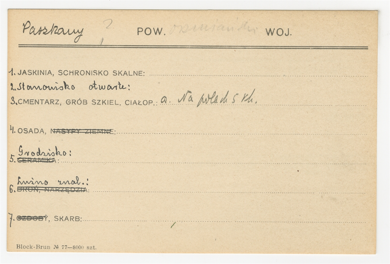 Element 1 - Karta stanowiska "Paszkany lub Parzkany pow. ? woj. [brak]" (druk rękopis) - strona 1