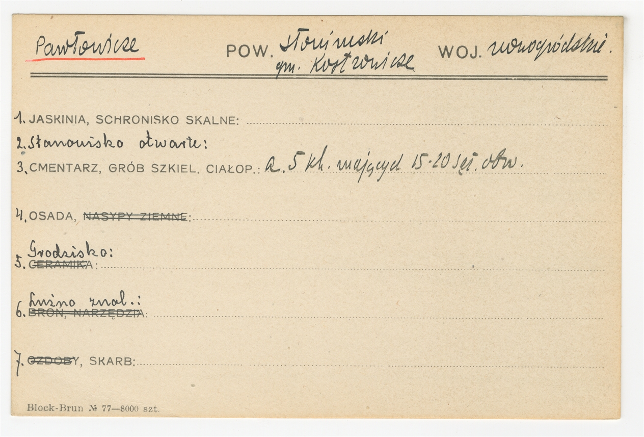 Karta stanowiska "Pawłowicze gm. Kostrowicze pow. słonimski woj. nowogródzkie" (druk rękopis) - strona 1