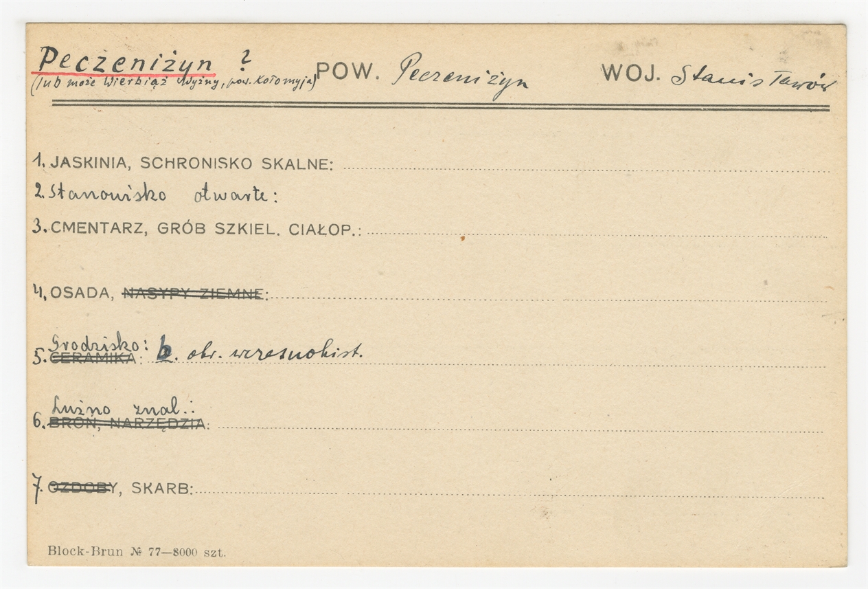 Karta stanowiska "Peczeniżyn ? (lub może Wierbiąż Wyżny pow. Kołomyja) pow. Peczeniżyn woj. Stanisławów" (druk rękopis) - strona 1