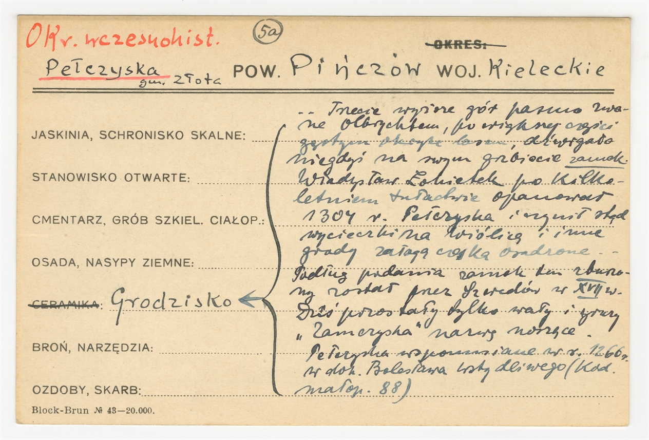 Karta stanowiska "Pełczyska gm. Złota pow. Pińczów woj. Kieleckie" (druk rękopis) - strona 1