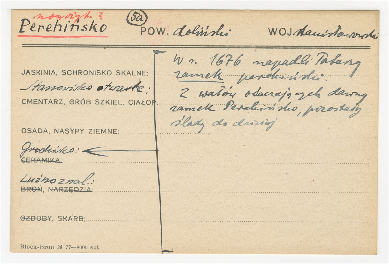 Element 1 - Karta stanowiska "Perehińsko pow. Doliński woj. Stanisławowskie" (druk rękopis) - strona 1