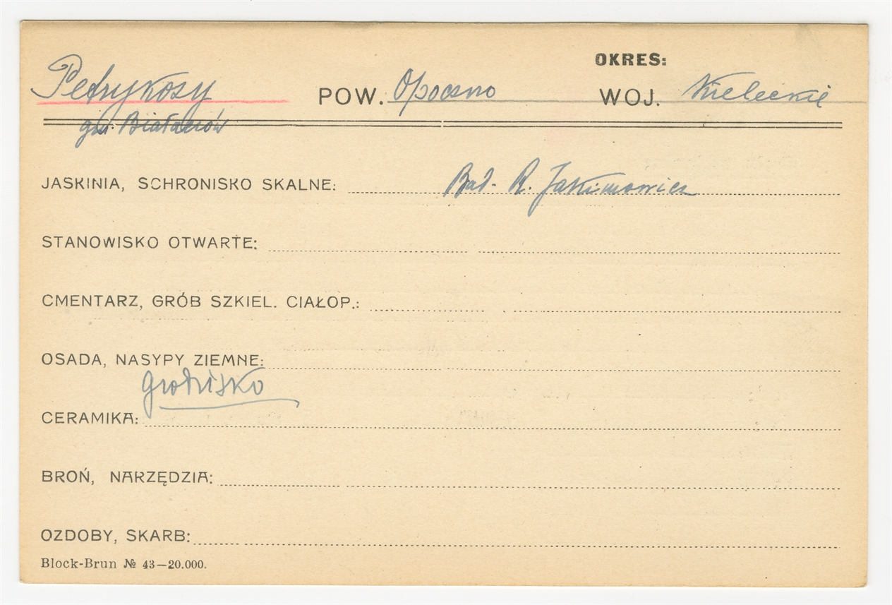 Karta stanowiska "Petrykozy gm. Białaczów pow. Opoczno woj. Kieleckie" (druk rekopis) - strona 1