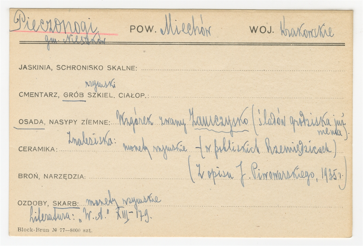 Karta stanowiska "Pieczonogi gm. Nieszków pow Miechów woj. Krakowskie" (druk rękopis) - strona 1