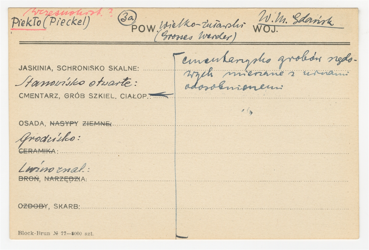 Karta stanowiska "Piekło (Pieckel) pow. wielko-żuławski (Grosses Werder) W.M. Gdańsk" (druk rękopis) - strona 1