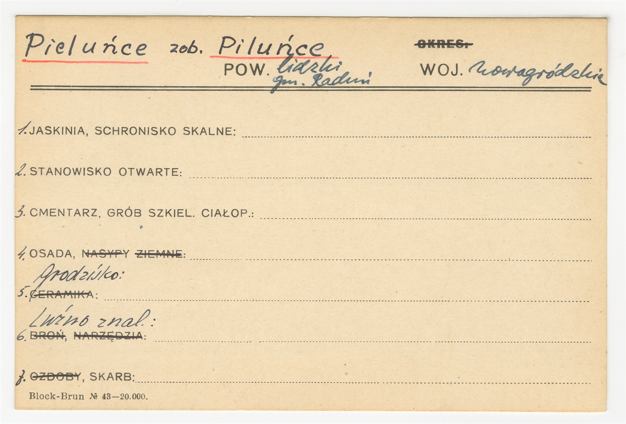 Karta stanowiska "Pieluńce zob. Piluńce gm. Raduń pow. lidzki woj. nowogródzkie" (druk rękopis) - strona 1