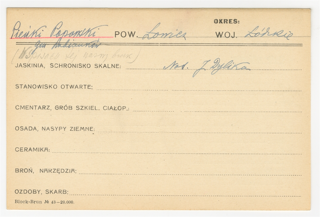 Karta stanowiska "Pieńki Popowski (W spisie tej nazwy brak) gm. Lubianków pow. Łowicz woj. Łodzkie" (druk rękopis) - strona 1