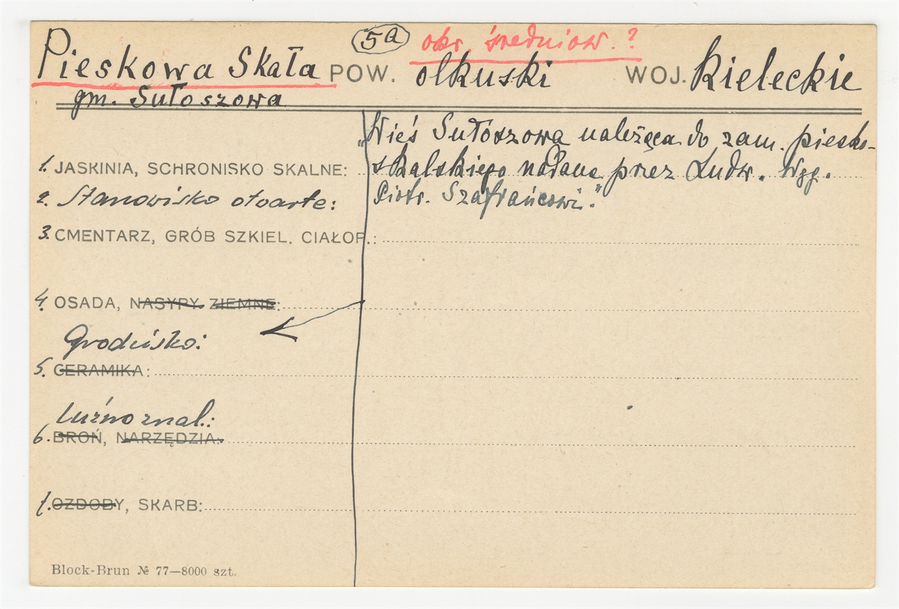 Karta stanowiska "Pieskowa Skała gm. Sułoszowa pow. olkuski woj. Kieleckie" (druk rękopis) - strona 1