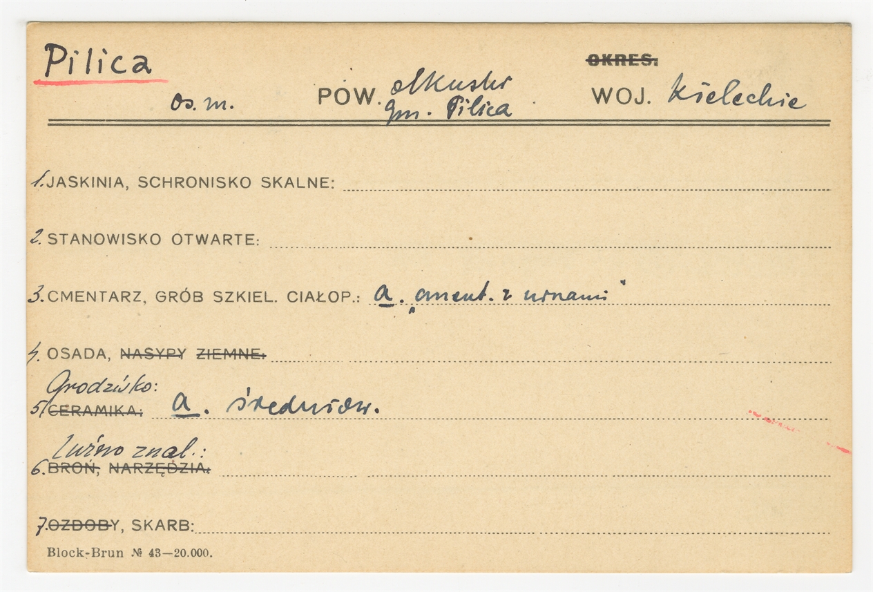 Karta stanowiska "Pilica os. M. gm. Pilica pow. olkuski woj. Kieleckie" (druk rękopis) - strona 1