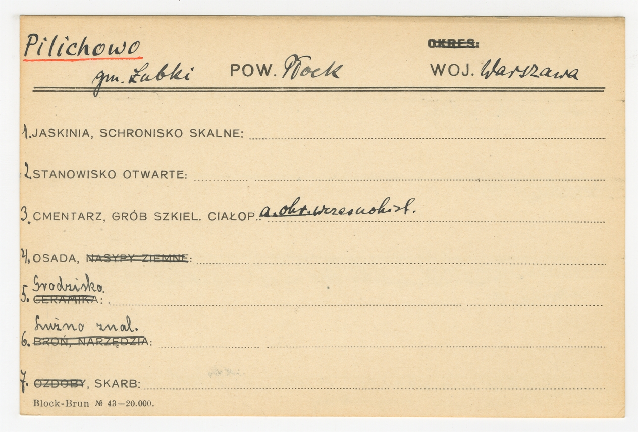 Karta stanowiska "Pilichowo gm. Łubki pow. Płock woj. Warszawa" (druk rękopis) - strona 1